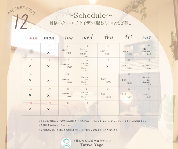 12月 スケジュール【骨格ベクトレ/腸もみ/よもぎ蒸し】